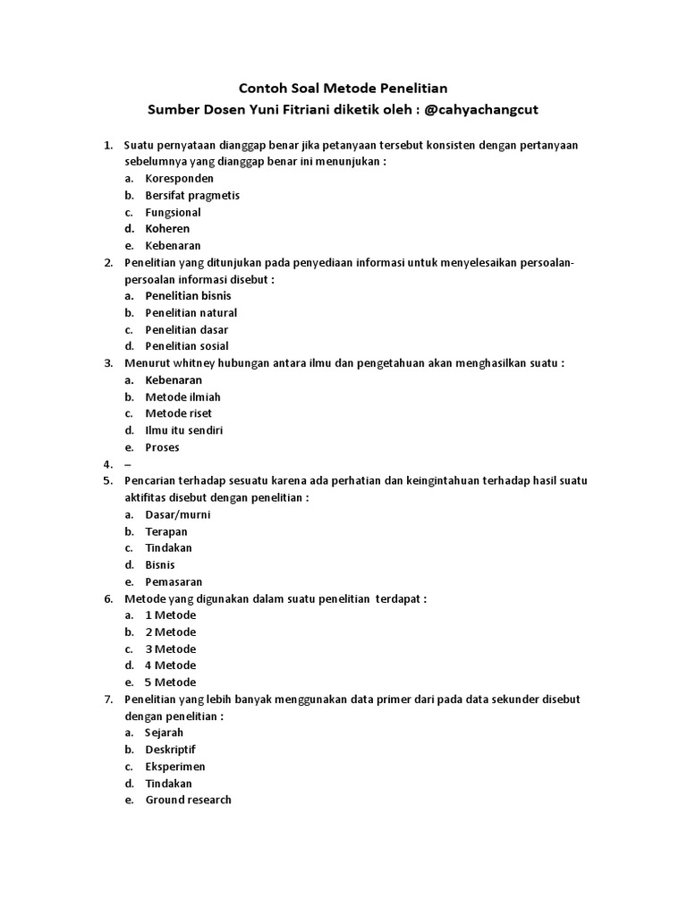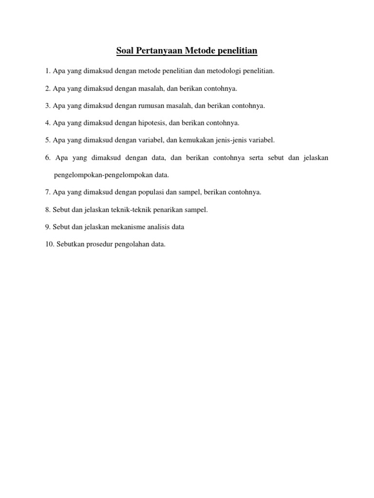 Jelaskan apa yang di maksud dengan pengukuran! Pada soal ini tujuan penelitian adalah mencari tahu penyebab mengapa objek wisata tidak berhasil menarik wisatawan. Metodologi juga merupakan analisis teoritis mengenai suatu cara atau metode. Penelitian historis banyak sekali macamnya. Latihan soal ini didapat dari berbagai sumber soal latihan metode penelitian (metlit) sebagai media materi belajar untuk persiapan ujian yang sesungguhnya.