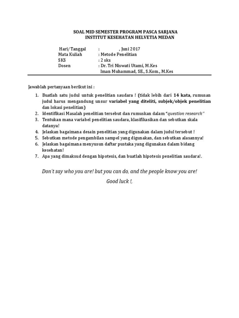Pada soal ini tujuan penelitian adalah mencari tahu penyebab mengapa objek wisata tidak berhasil menarik wisatawan. Contoh soal dan jawaban metode penelitian. 63% (16) 63% menganggap dokumen ini bermanfaat (16 suara) Tinggalkan komentar soal pertemuan 3 dan 4 1. Kunci jawaban latihan soal uts, uas, metode penelitian (metlit) mei 15, 2020. Kegiatan ini merupakan ajang pelatihan dan pengenalan bentuk soal yang akan diujikan pada ujian akhir semester uas dan juga sekaligus sebagai wahana untuk mengetahui seberapa jauh materi ini telah. Beijing lebih macet dan udaranya lebih kotor dari pada jakarta. Metode yang longgar dan fleksibel c. Suatu pernyataan dianggap benar jika pernyataan tersebut konsisten dengan pernyataan sebelumnya yang dianggap benar, ini menunjukkan : Disesuaikan dengan kemampuan guru jawab: Abel ingin meneliti kesadaran pelajar tingkat sma terhadap lingkungan. Contoh soal uas metode penelitian bsijawaban contoh soal uas. Sama sekali tidak menggunakan angka.